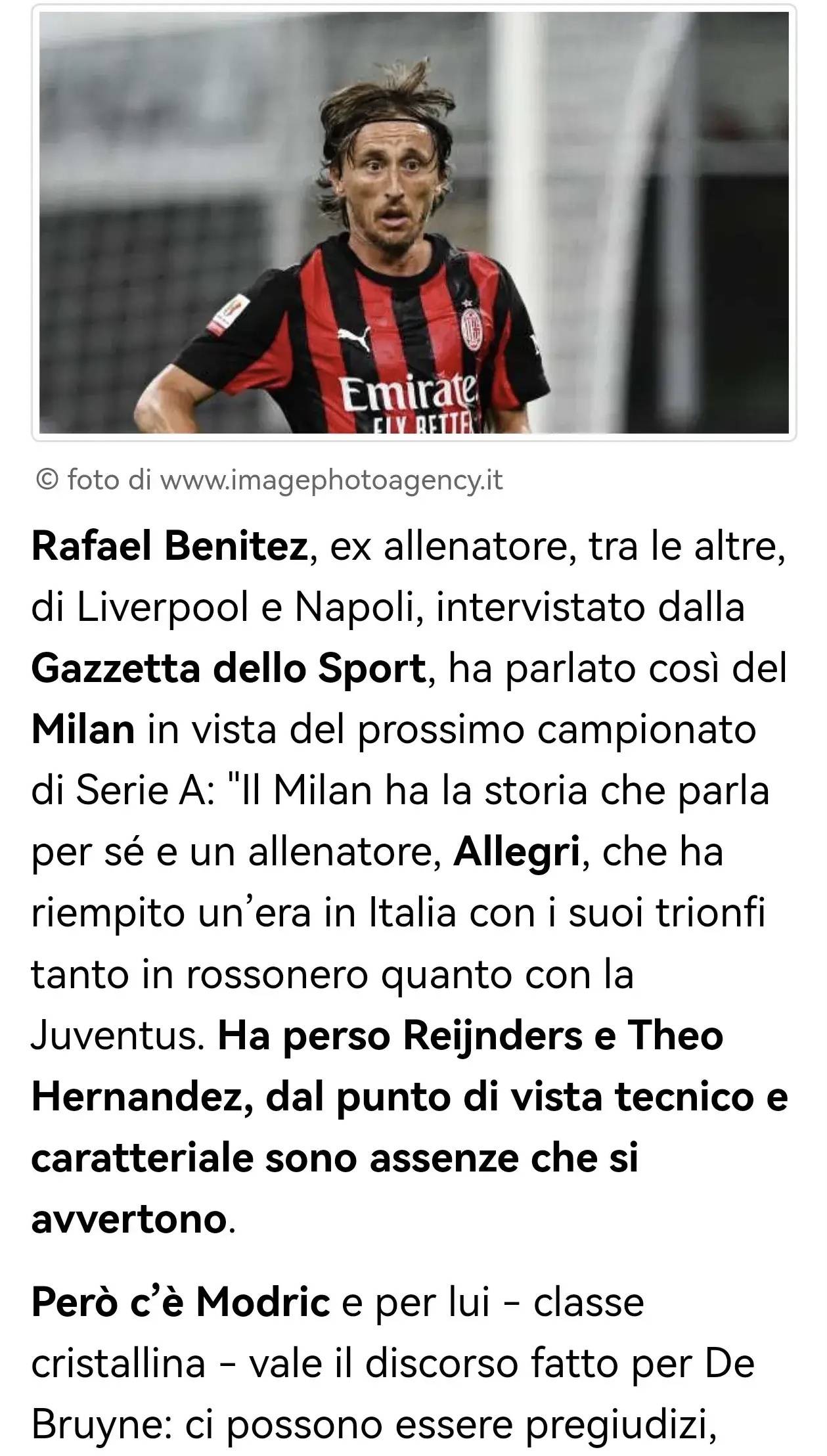 意甲:前利物浦主帅贝尼特斯谈新赛季的米兰,阿莱格里会创造一个时代,他们今年还来了莫德里奇